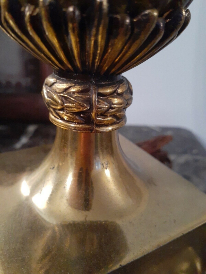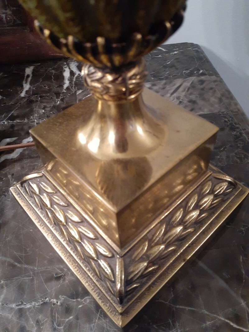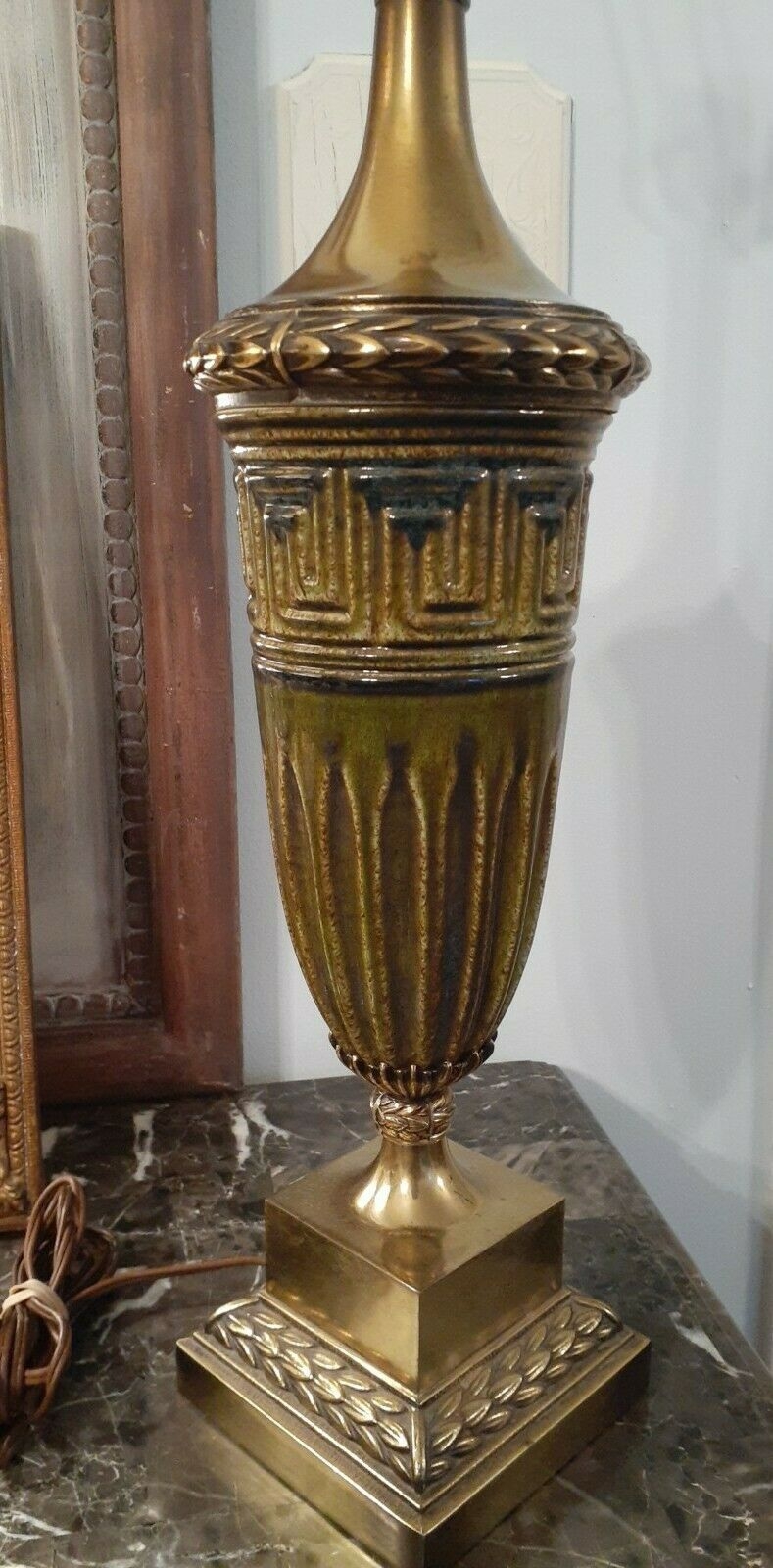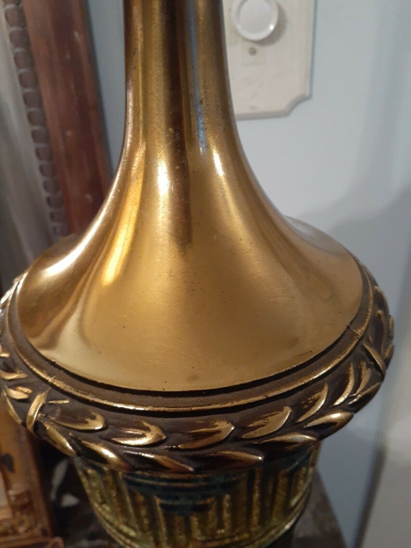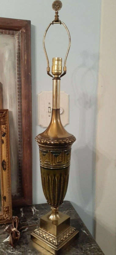 Hãy đầu tư vào ngôi nhà của bạn với sự HIẾM này! Đèn đồng thau cổ điển Honi Chilo Green Gốm sứ Hy Lạp chìa khóa giữa thế kỷ hiện đại. đàn hạc gốc và finial tuyệt đẹp. Tình trạng là "Đã qua sử dụng tốt" với một số hao mòn liên quan đến độ tuổi. Không có chip hoặc vết nứt. Cao khoảng 32,5 "bao gồm cả đàn hạc và đàn. Chu vi khoảng 21" ở điểm rộng nhất. Hãy chú ý đến các hình ảnh vì chúng là một phần của mô tả mặt hàng.